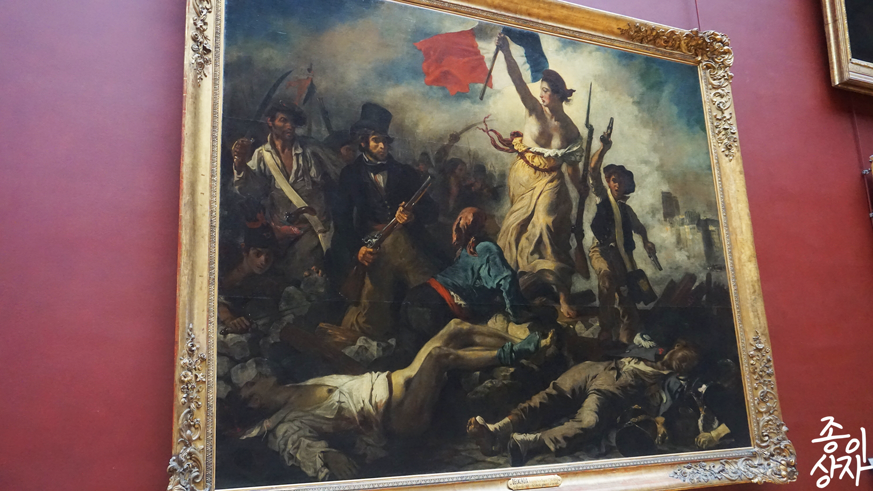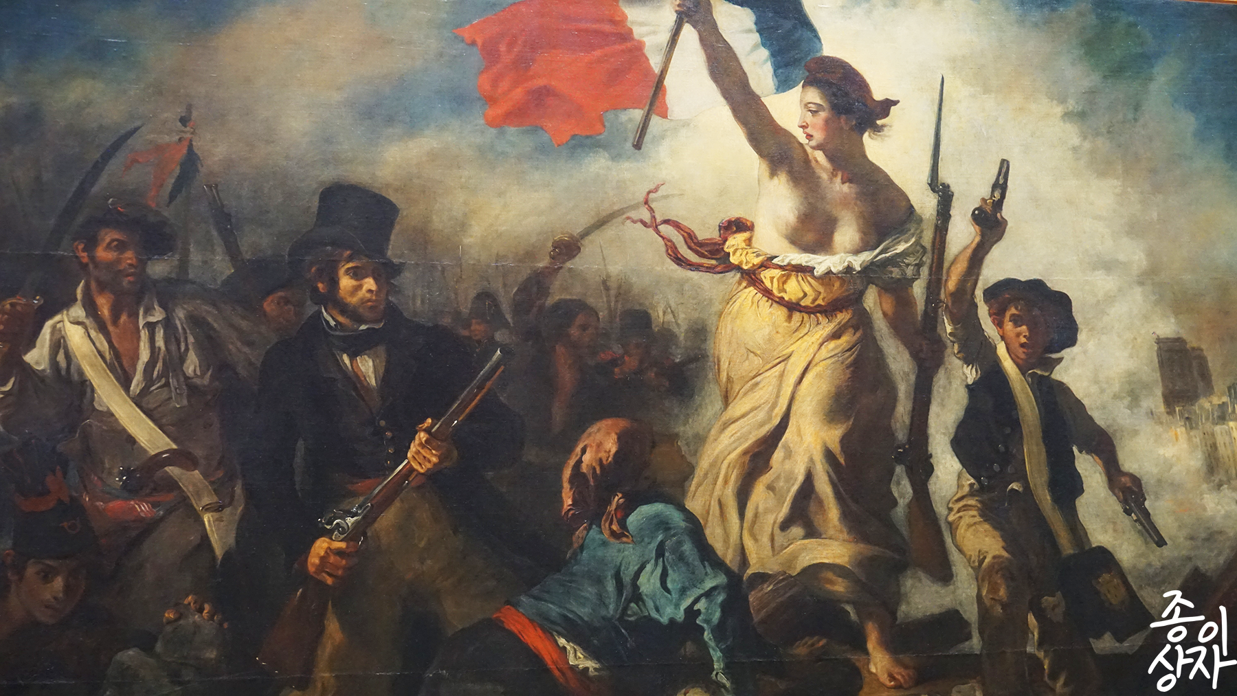 제리코의 다른 작품이자 더 유명한 작품인 민중을 이끄는 자유의 여신. 매우 사실적인 묘사이면서 고전적인 묘사로 유명한 작품이다. 민중을 이끄는 여인은 실존 모델이 있는 것은 아니고 추상적인 관념을 형상화한 인물이라고 한다. 이 그림은 의도적으로 국기에 들어가는 세 가지 색을 많이 사용해서 그려졌다고 알려졌다. 등장하는 인물이 많기는 하지만 상승 형태의 피라미드 구조를 통해서 군중을 이끄는 여인에게 관심이 쏠리도록 만들었다.