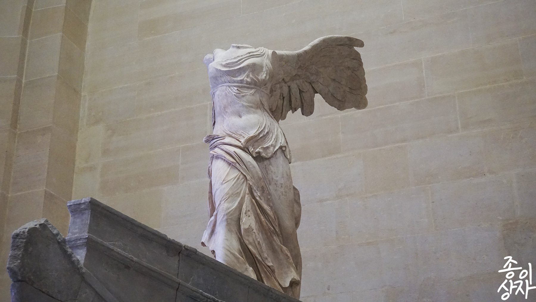사모트라스의 니케! 승리의 여신, 니케의 여신사로 더욱 유명할 것이라 생각한다. 아마도 루브르에 있는 작품 들 중 열 손가락 안에 꼽히는 작품이지 않을까 싶다. 제일 유명하다고 하기에는 모나리자가 있으니 차마... 승리의 여신이 뱃머리에 내려선 모습을 묘사한 것으로 바람에 의해 흩날리는 옷자락과 내려서는 순간을 포착한 것이다.. 2세기 경에 유행했던 헬레니즘의 명작으로 손꼽힌다. 지금 생각해보니 새삼 대단하다. 2세기면 지금까지 거의 2천년 전의 작품인 것인데, 아직까지 형상이 남아 현 인류애게 그 자태를 보이고 있으니. 아마도 지금의 모습을 갖추기 위해서는 수없이 많은 복원 과정을 거쳐야만 했을 것이다. 19세기에 발견되어 오랜 복원 과정을 거쳤다고 하니, 그 정성이 상상이 된다. 날개도 왼쪽만이 발견되어 오랜 검토를 통해 양쪽이 같은 모양일 것이라 추정되어 오른쪽을 복원한 것이라 한다. 유명한 조각상이다 보니 근처에 사람들이 많았다. 우리도 근처에서 잠시 다리를 쉬어주면서 니케를 바라보다가 다시 자리를 옮겼다.