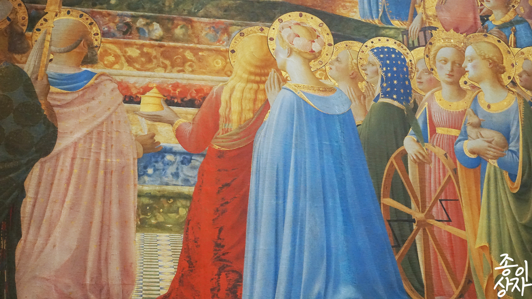 성모의 대관식. 선명한 금색과 파란 하늘이 선명한 대조를 이루는 그림. 타일 바닥으로 기하학적 1점 투시를 만들어 냈다. 금색 부분이 빛을 받아 반짝 반짝 빛나고 있어서 다른 그림들 사이에서 꽤나 눈에 띄었다.