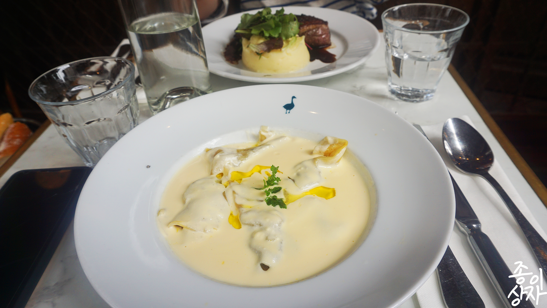 오리고기 스테이크는 껍질은 바삭하고 기름기가 적당히 남아 촉촉한 고기였다. 약간 두텁고 고급진 오리 훈제를 먹는 기분이었는데, 매우 부드러웠기에 평소에도 오리 고기를 매우 좋아하는 나로서는 만족스러운 선택이었다. 소스도 맛있어서 꽤나 맛있게 먹었다. 푸아그라 라비올리는 크림소스가 베이스였는데, 그 소스가 부드럽고 맛있으며 반죽이 부드럽고 맛있었다. 푸아그라의 맛이 어떤 맛인지는 잘 모르고 먹었는데, 내가 이때 먹으면서 느낀 맛이 푸아그라의 맛이라면 그렇게까지 강하게 느껴지는 것은 아니었다. 하지만 그래서 더 만족스러웠다. 푸아그라가 약간 느끼하고 물릴 수 있는 맛인데 라비올리가 그것을 잡아주는 것 같았다. 위에 트러플 오일이 뿌려저 있었어서 트러플의 맛도 약간 났다. 개인적으로 푸아그라는 그렇게까지 내 취향은 아닌 것 같다.